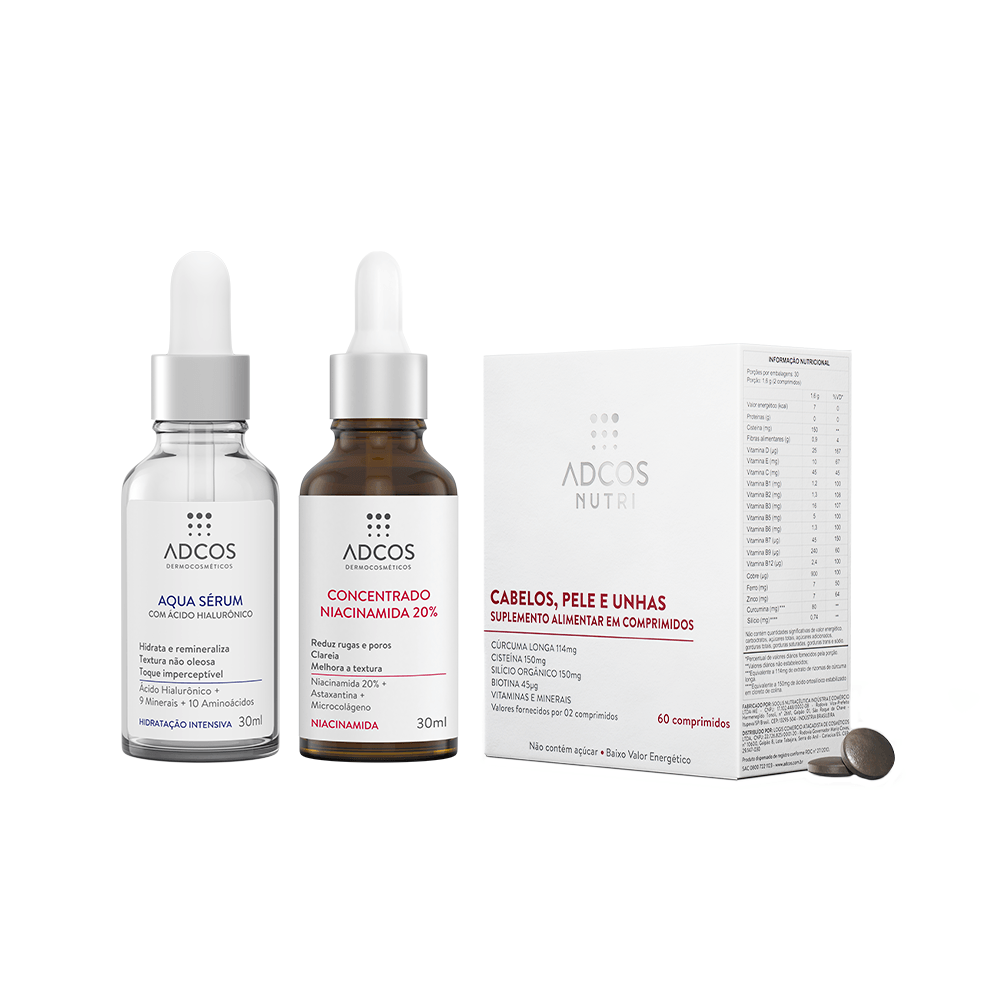 O ADCOS Nutri Cabelos e Unhas é um suplemento alimentar em cápsulas que fornece nutrientes fundamentais a base de Cúrcuma Longa, Silício Orgânico, Biotina, Zinco, Cisteína, Niacinamida, Vitaminas e Minerais. Possui altíssima concentração de silício orgânico e cisteína, além de 100% da IDR (Ingestão Diária Recomendada) em todas as vitaminas do Complexo B, Vitaminas C, D, E, Zinco e Cobre. A suplementação diária desse nutricosmético cria um microambiente favorável ao crescimento dos fios capilares e das unhas.