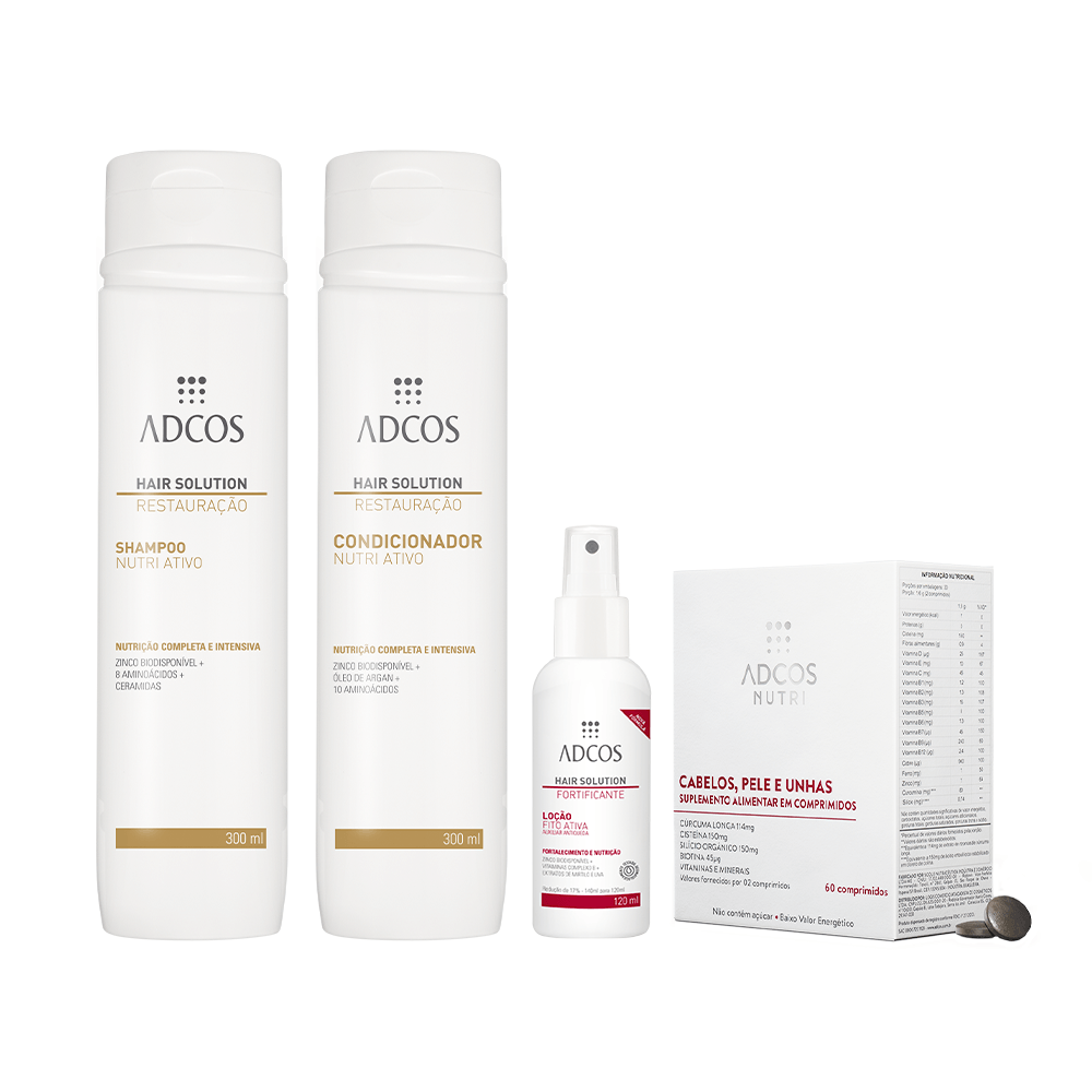 Uso separado:Passo 1: Aplique o Hair Solution Shampoo Nutri Ativo sobre os cabelos massageando suavemente com as pontas dos dedos e depois enxague. Se necessário, repita a operação. Passo 2: Após lavar os cabelos, aplique o Hair Solution Condicionador Nutri Ativo no comprimento dos fios, evitando a raiz. Deixe agir por 1 minuto e, em seguida, enxague. Passo 3: Aplique o Hair Solution Loção Fito Ativa sobre o couro cabeludo duas vezes ao dia, pela manhã e à noite. Massageie delicadamente e não enxague. Passo 4: Ingerir 02 cápsulas Adcos Nutri Cabelos, Pele e Unhas, ao dia. Uso adulto a partir de 19 anos. Não exceder a recomendação diária de consumo indicada na embalagem. Este produto não é um medicamento. Este produto não deve ser consumido por gestantes, lactantes e crianças.